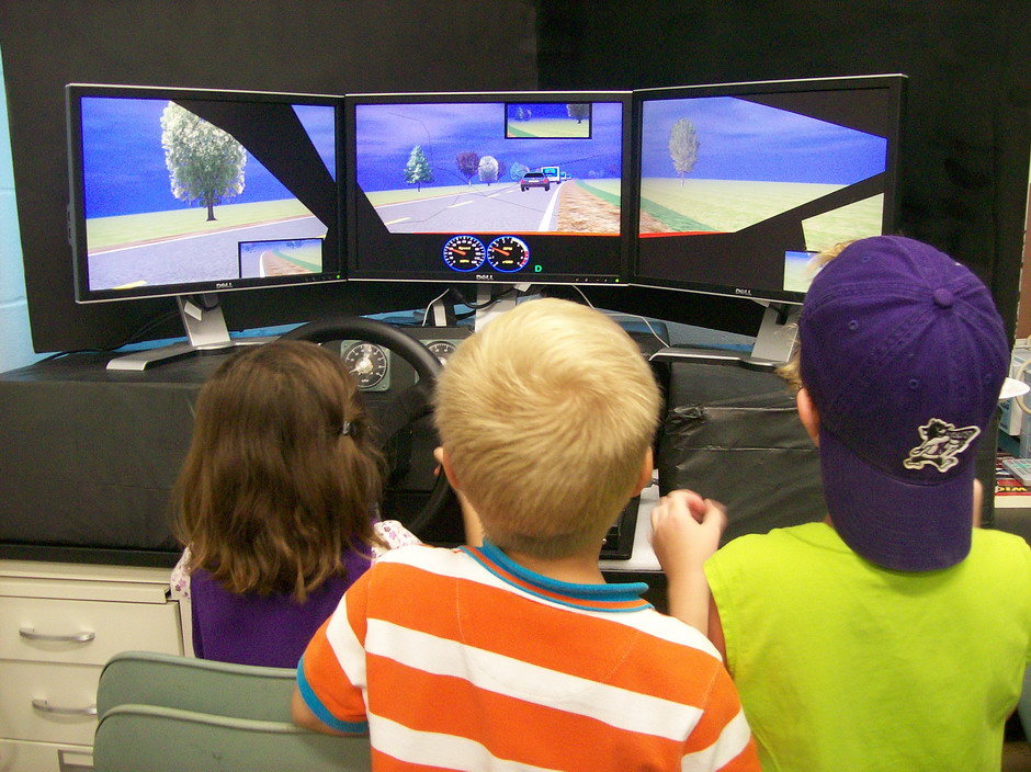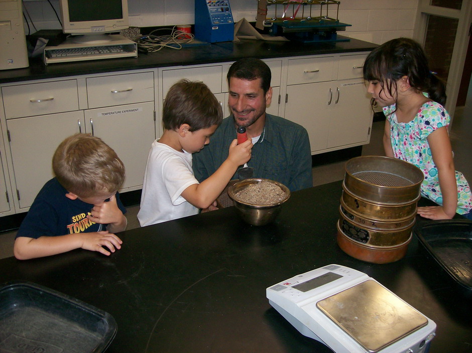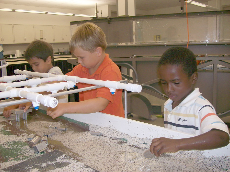 On June 23, 2010, with over a 100º heat index, participants in SIUE's Early Childhood Center school-age program walked to the Engineering Building to visit the civil engineering (CE) labs. Mr. Vaughn demonstrated open channel flow. Dr. Morgan introduced stream flow and erosion. Dr. Werner crushed concrete and demonstrated floating concrete. Mr. Alyaseri, helped them sieve sand. And, a highlight of their trip, Mr. Mostafa Gahrooei, CE graduate student, supervised them while they used the driving simulator.