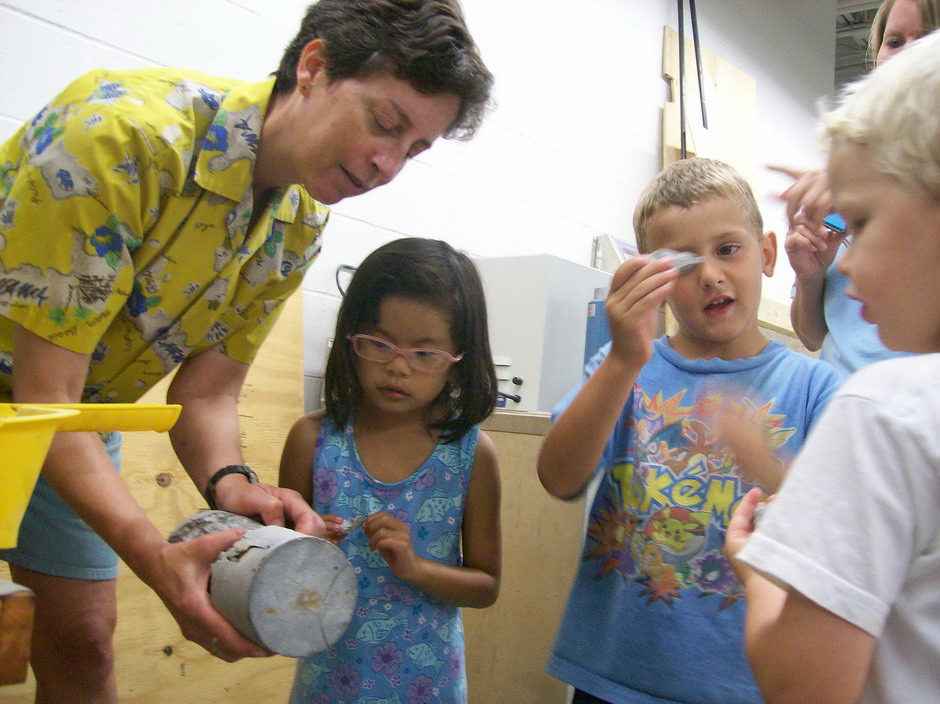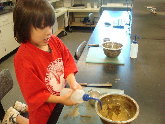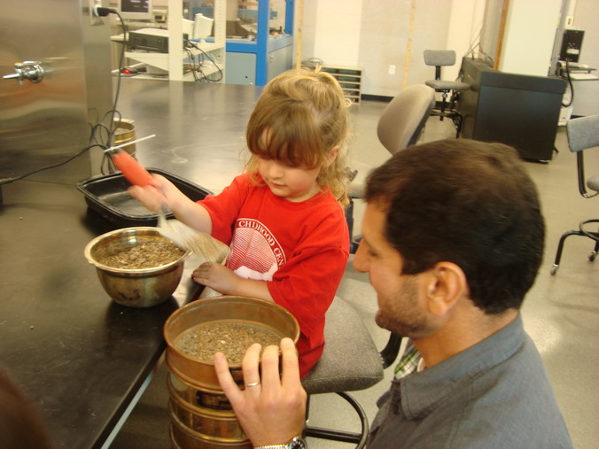 On June 4, 2010 the civil engineering (CE) labs were teeming with preschoolers from SIUE's Early Childhood Center. The Willow Room visited to learn about some basic CE concepts. Mr. Brent Vaughn, CE lab specialist, demonstrated open channel flow and what happens to concrete when it's crushed. Dr. Susan Morgan, CE Professor and Chair, introduced stream flow and erosion. And the kids played with clay soil with Dr. Anne Werner, Construction Department Assistant Professor, and with sand with Mr. Isam Alyaseri, CE graduate student, to learn how the different soils behave when they are mixed with water.