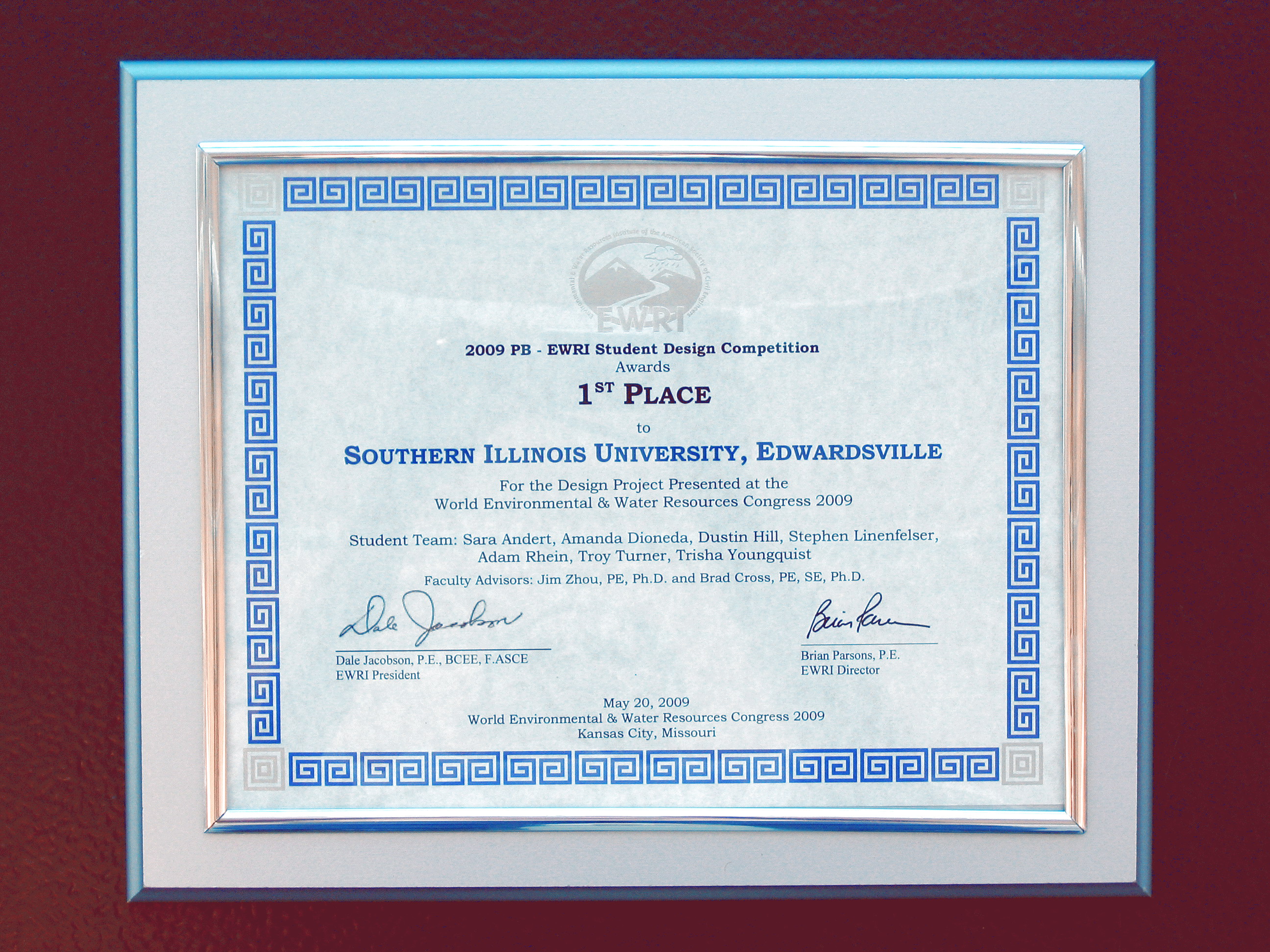 The Fall 2008 Civil Engineering Senior Design Environmental Student Team at Southern Illinois University Edwardsville (SIUE) took first place honors in the Parsons Brinckerhoff Environmental and Water Resources Institute Student Design Competition held in conjunction with the 2009 ASCE EWRI World Water and Environmental Congress May 17-21, 2009 Kansas City, Missouri. The team had been previously selected from national entries to compete as finalists in the Congress.The presenters at the conference included Stephen Linenfelser, Troy Turner, and Trisha Youngquist (team leader).Other members of the SIUE design group included Sara Andert, Amanda Dioneda, Dustin Hill, and Adam Rhein.Faculty sponsors of the team are Profs. Jianpeng (Jim) Zhou and Brad Cross.