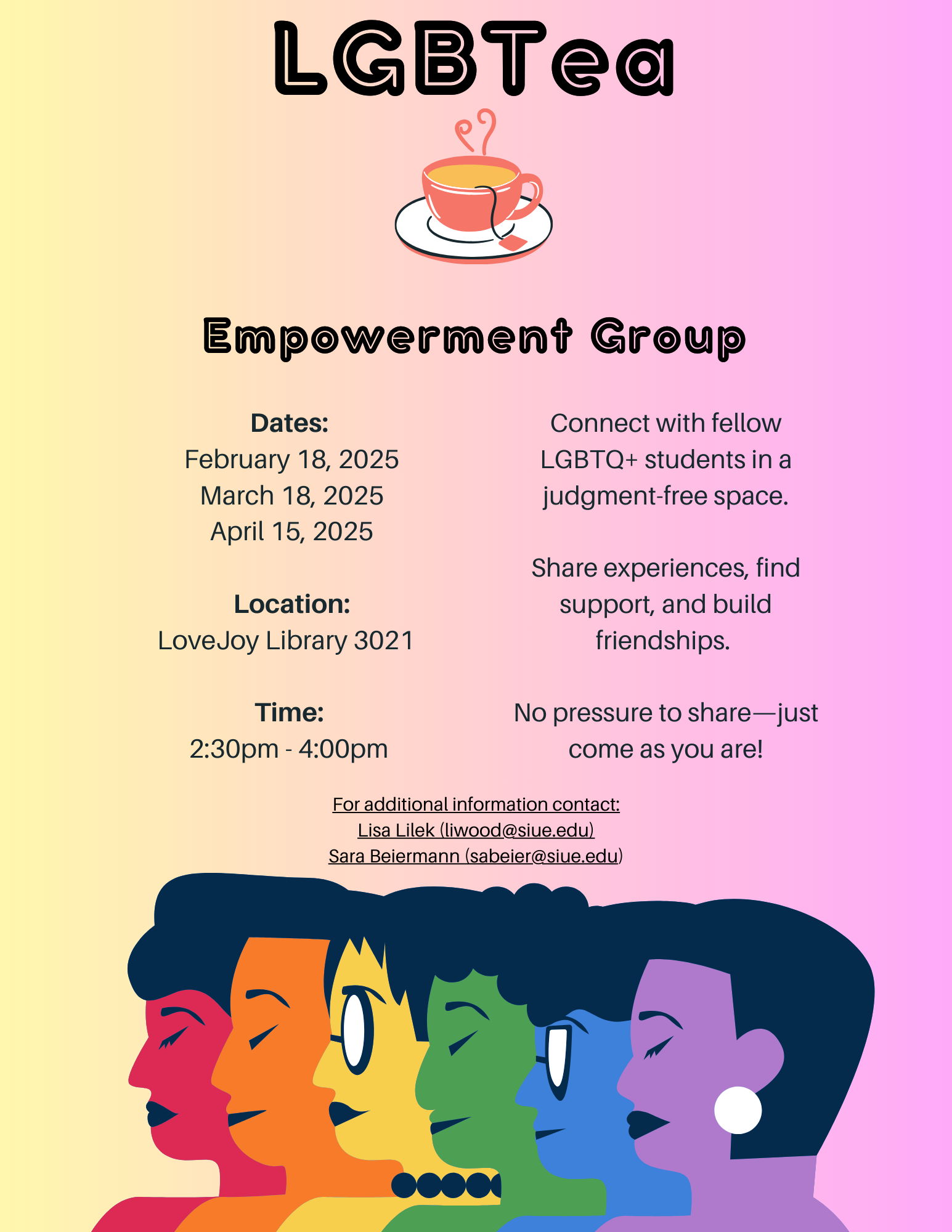 LGBTea Empowerment Group, Meeting March 18 and April 15 in LL 3021 from 2:30pm - 4:00pm. Connect with fellow LGBTQ+ students in a judgment-free space. Come as you are! Contact Lisa Lilek or Sara Beiermann for more information. Flyer here.